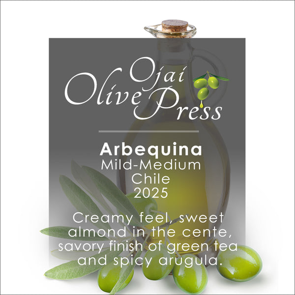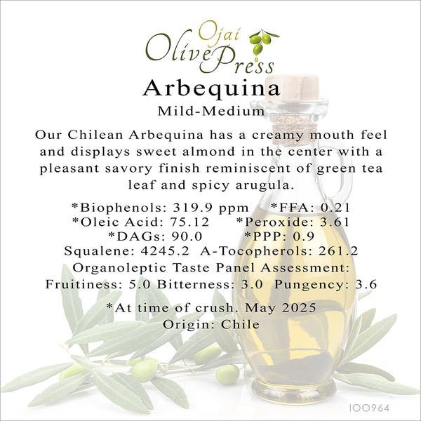 Our Chilean Arbequina has a creamy mouth feel and displays sweet almond in the center with a pleasant savory finish reminiscent of green tea leaf and spicy arugula.