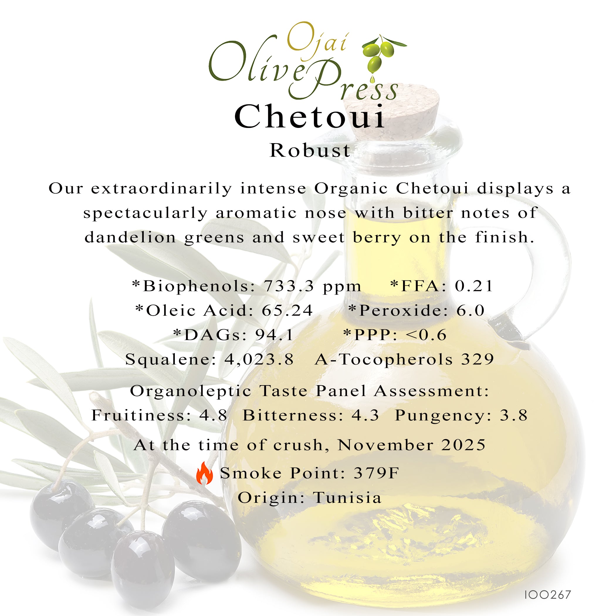 Our extraordinarily intense Organic Chetoui displays a spectacularly aromatic nose with bitter notes of dandelion greens and sweet berry on the finish.