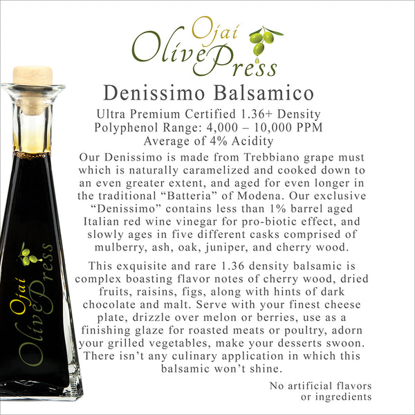 Denissimo Balsamico (Ultra Premium) Certified 1.36+ Density Our Denissimo is made from Trebbiano grape must which is naturally caramelized and cooked down to an even greater extent, and aged for even longer in the traditional "Batteria" of Modena. Our exclusive...