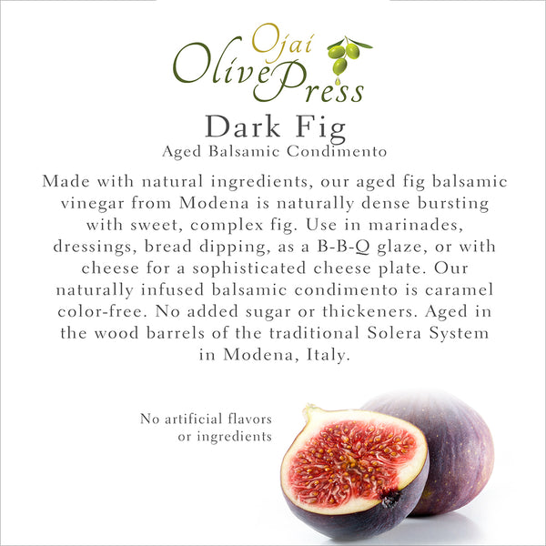 Aged Fig Balsamic Vinegar Condimento Made with natural ingredients, our aged fig balsamic vinegar from Modena is naturally dense bursting with sweet, complex fig. Use in marinades, dressings, bread dipping, as a B-B-Q glaze, or with cheese for a sophisticated...