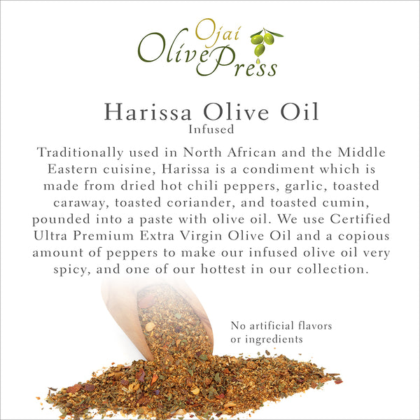 All Natural Harissa Infused Olive Oil Traditionally used in North African and the Middle Eastern cuisine, Harissa is a condiment which is made from dried hot chili peppers, garlic, toasted caraway, toasted coriander, and toasted cumin, pounded into a paste...