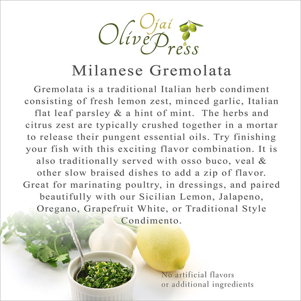 Milanese Gremolata Olive Oil Our UP Certified Extra Virgin Olive Oil is infused with Gremolata - a traditional Italian herbal condiment consisting of fresh lemon zest, minced garlic, Italian flat leaf parsley & a hint of mint. The herbs and...