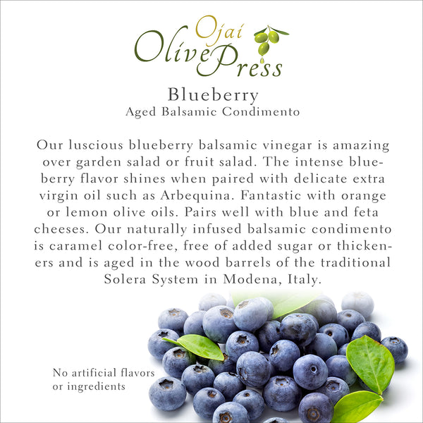 Aged Blueberry Balsamic Vinegar Condimento Our luscious blueberry balsamic vinegar is just as amazing over garden salad as it is over fruit salad. When paired with delicate extra virgin oil such as Arbequina, the intense blueberry flavor will shine. Also...