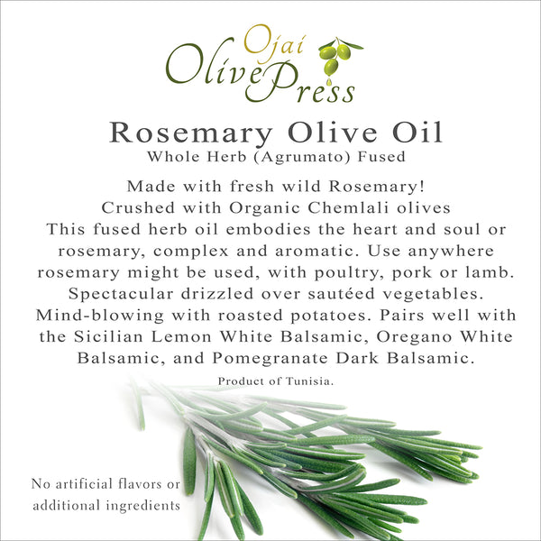 Whole Herb Fused Rosemary (Agrumato) Olive Oil Made with fresh wild Rosemary! Crushed with Organic Chemlali olives This fused herb oil embodies the heart and soul or rosemary. It is both complex and aromatic. Use anywhere rosemary might be used....